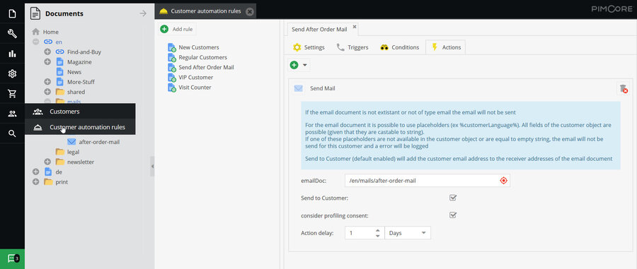 Sample marketing automation rule for sending mail 1 day after order is placed.